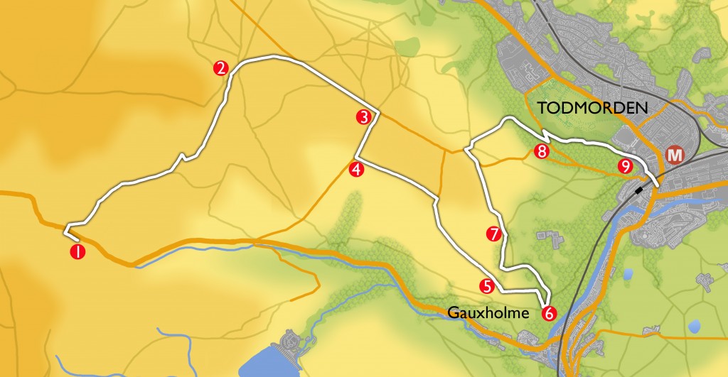 A meandering walk from the mining hillside of Todmorden Moor through small hamlets to standing stones, past a once “stately home” dropping down to Centre Vale Park and the town centre.