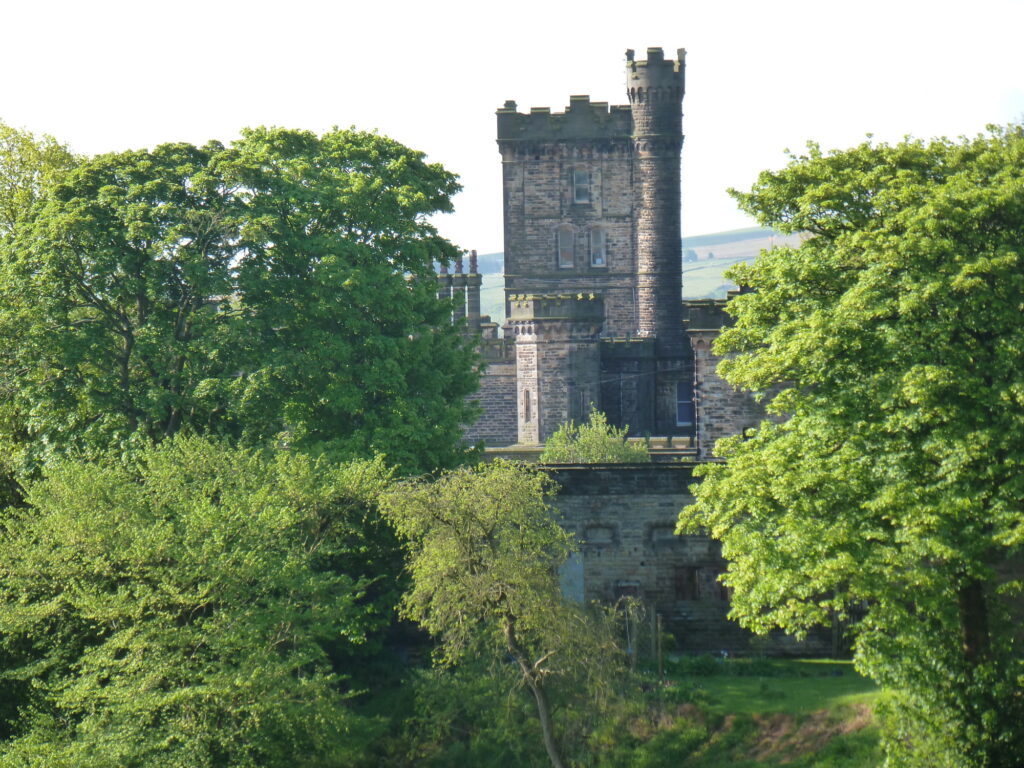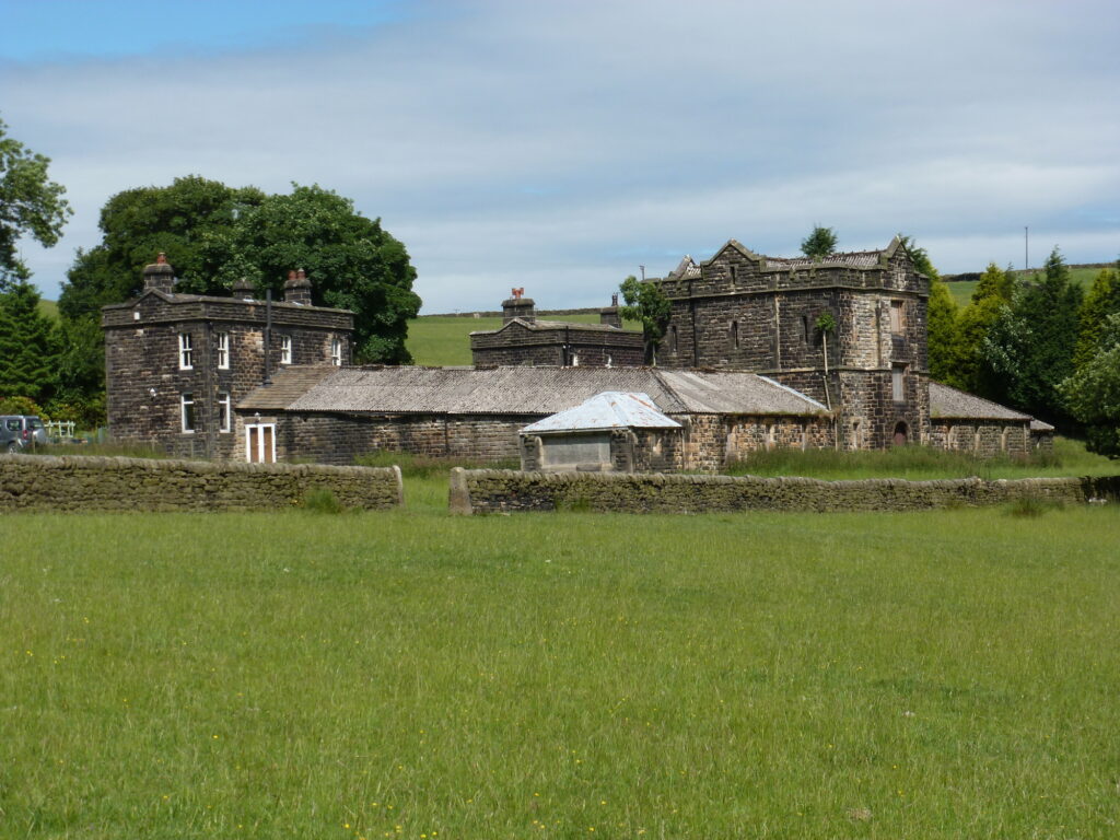 - Start to descend and when the wall on left ends take the signposted path on the left down the grassy hillside, with the Rochdale Road valley below on your right. After a short steep descent down some steps you come out onto another road (Stones Road). You are on the Calderdale Way,a way marker symbol is painted on the wall to your left, by a grit box. Go left, uphill, passing the entrances to Lob Quarry and Pex House, with views of Dobroyd Castle to your right.Dobroyd Castle was built by John Fielden, son of “honest” John Fielden between 1866 and 1869. The architect was John Gibson who also designed the Unitarian Church(1869) and Town Hall(1875) in Todmorden, and the grounds were laid out by Edward Kemp. The Castle was a family home to the Fieldens until it was sold to the Home Office in the 1940’s. Since then it has been an Approved school, a privately run residential school, a Buddhist Centre and a Children’s Activity Centre.Continue along the track until the gates to Stones hamlet are on your left. Bear to the right on to a grassy track following the sign for the Calderdale Way. The other side of the third standing stone can now be seen on the left. The substantial buildings on the right were the model farm built to serve Dobroyd Castle.